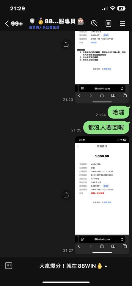 88win 儲值已轉帳不上分,客服也不回應!