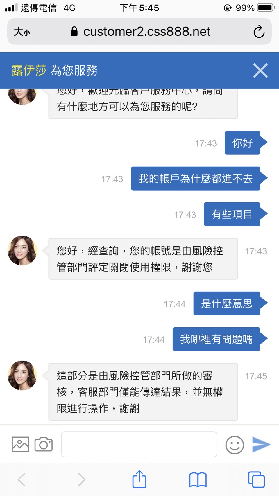 說什麼風控 有問題 笑了 有玩的建議別玩了 能收就收 別玩大 以免收不回 客服只會鬼打牆 爬了些文也有人出金拿不回的 各位萬萬小心了