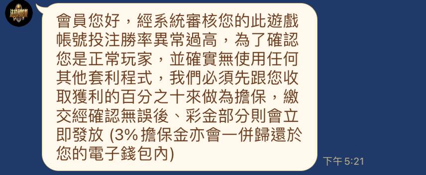 請問法拉利娛樂城是否為黑網會不會出金?因為現在要出金 他說我連勝過多 要儲值3%獲利進去就可以提出 請問是否可以出金?還是投下去就石沈大海了
