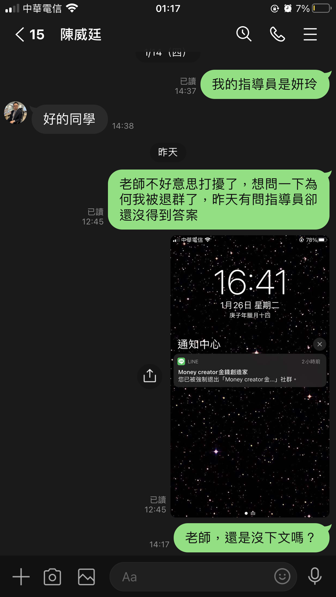 1/26 09:21問指導員怎麼提領金額,14點多時被強制退出社群,之後有問指導員原因就是沒回我