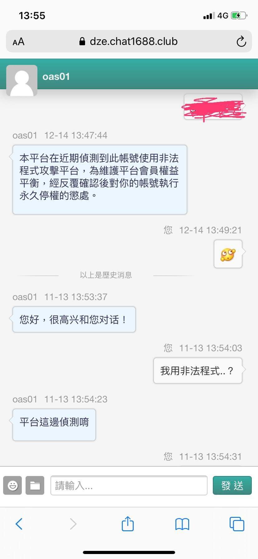 等到今天中午詢問客服說我使用非法程式 帳號停權
