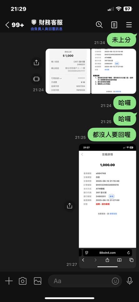88win 儲值已轉帳不上分,客服也不回應!